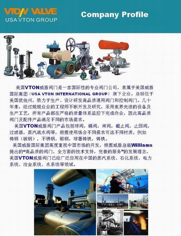 美國威盾國際集團(tuán)高度重視中國市場的開發(fā),根據(jù)威盾總裁Williams提出的“高品質(zhì)的閥門,全方面的技術(shù)支持,完善的服務(wù)”的發(fā)展理念,美國VTON威盾閥門已經(jīng)廣泛應(yīng)用在中國的蒸汽系統(tǒng)、石化系統(tǒng)、電力系統(tǒng)、冶金系統(tǒng)、水系統(tǒng)等領(lǐng)域。 |